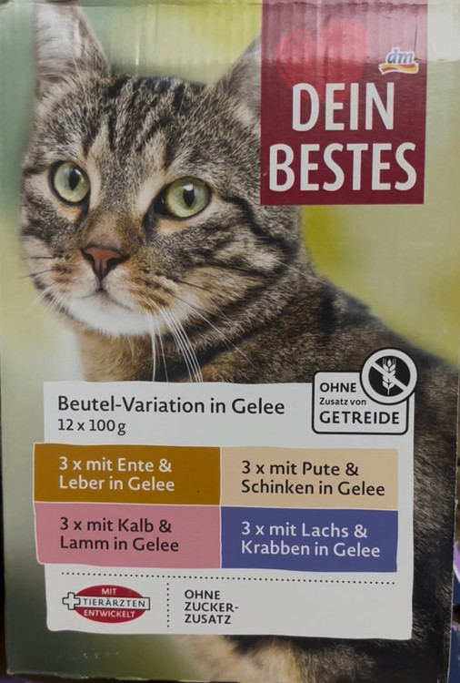 پوچ گربه ی 100 گرمی دین بست(dein bestes) برپایه گوشت بره و ماهی و خرچنگ و بوقلمون در ژله موجود میباشد. این پوچ به حفظ وزن ایده ال در گربه ها و تامین ویتامین های مورد نیاز آنها کمک میکند. گربه ها حیوانات گوشتخوار هستند و رژیم غذایی بر پایه گوشت بره سرشار از پروتئین میاشد که برای سلامتی و سیستم ایمنی گربه ها مفید است. این رژیم غذایی عمدتا شامل آب ، پروتئین و چربی است که محتوای آن کمتر از 10٪ کربوهیدرات میباشد. محتوای بالای آبِ آنها باعث افزایش آب بدن گربه می شود و این امر در دراز مدت باعث سالم نگه داشتن کلیه و مثانه گربه خواهد شد. از آنجا که مواد تشکیل دهنده در این پوچ وژله موجودبافت لطیفی به این محصول میدهدباعث شده به راحتی توسط دستگاه گوارش گربه هضم می شوند . محصول کشور آلمان میباشد.